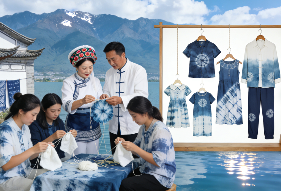 如今的白族扎染,早已不是人们印象中单调的传统桌布、窗帘模样,而是成功拓展出服饰、文具、家居装饰、文创产品等2000多个品类,其中80%的产品远销欧美、日韩等海外市场。年轻一代更是为扎染注入了新的时尚活力:极简风的扎染T恤、清新可爱的亲子装、设计感十足的连衣裙,成了网红穿搭博主的心头好;以大理“风花雪月”为灵感的“苍山洱海月”系列扎染作品,更是将当地的自然风光巧妙绣进布帛之中,兼具艺术感与纪念意义。这门古老手艺不仅带动了周边2000多名村民灵活就业,让不少外出务工的年轻人看到了返乡传承的希望,更真正实现了“一门非遗手艺,带富一方百姓”的美好愿景。